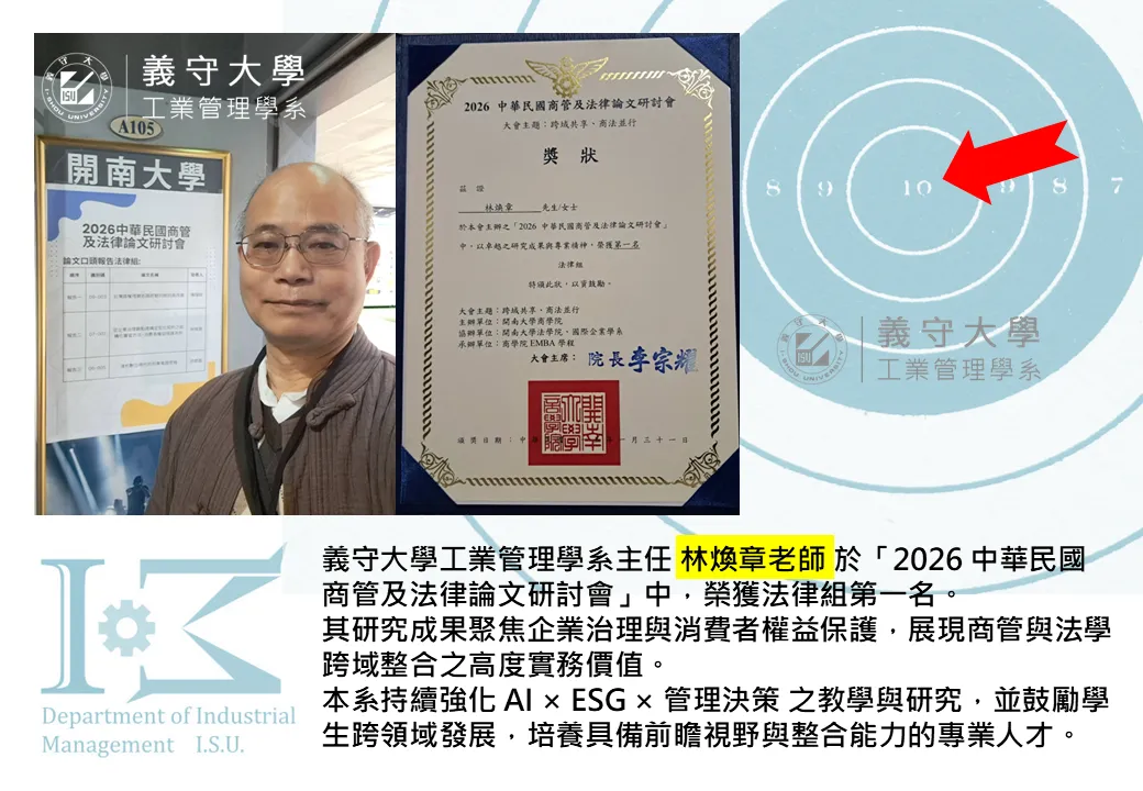 義守大學工業管理學系主任 林煥章老師 於「2026 中華民國商管及法律論文研討會」中,榮獲法律組第一名。