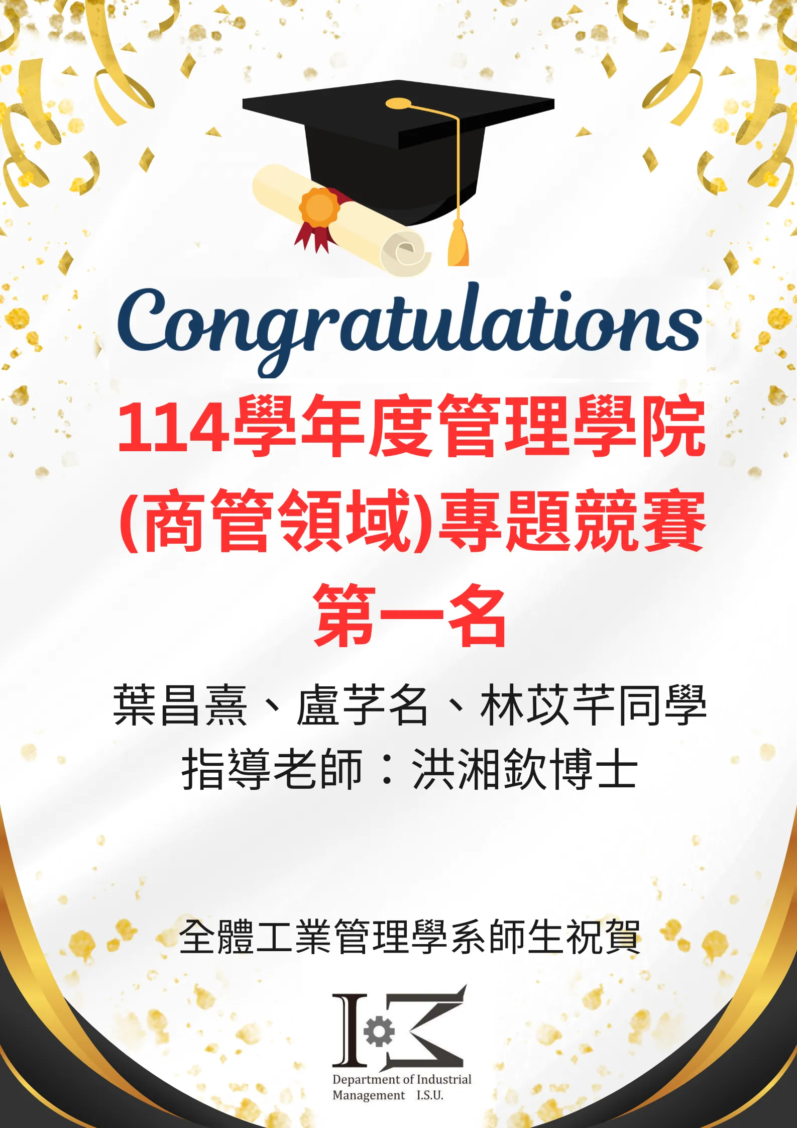 賀!114學年度管理學院(商管領域)專題競賽 第一名